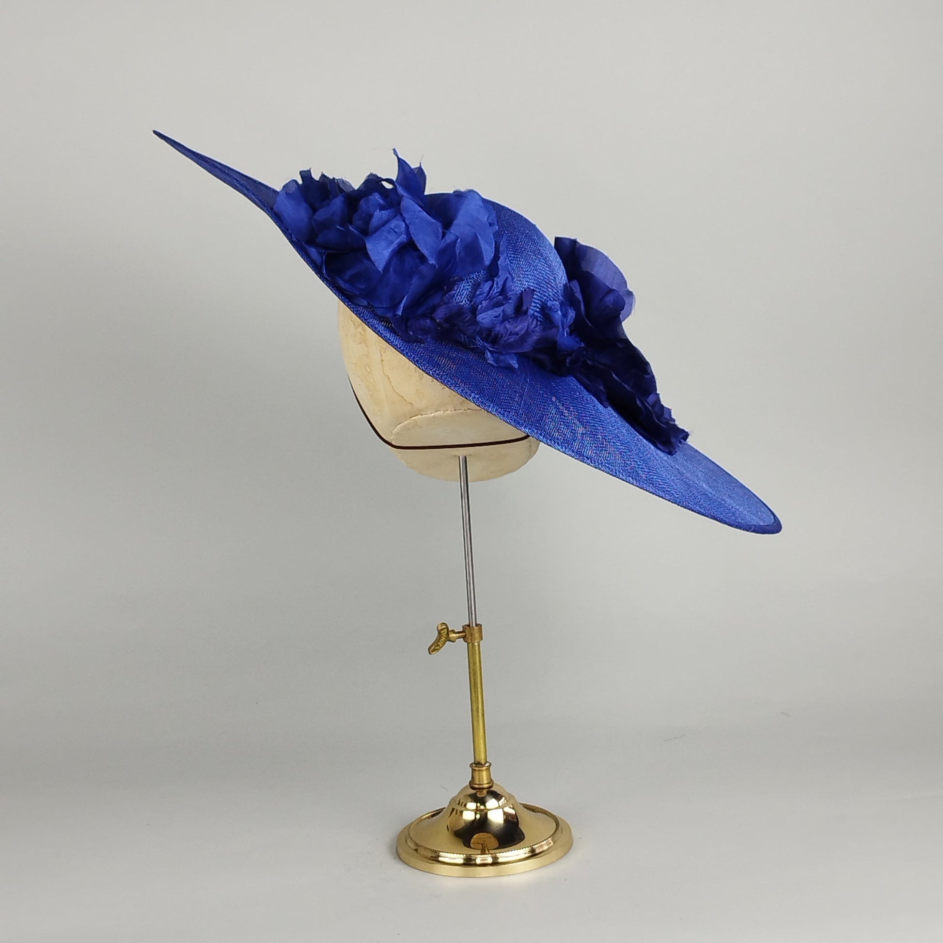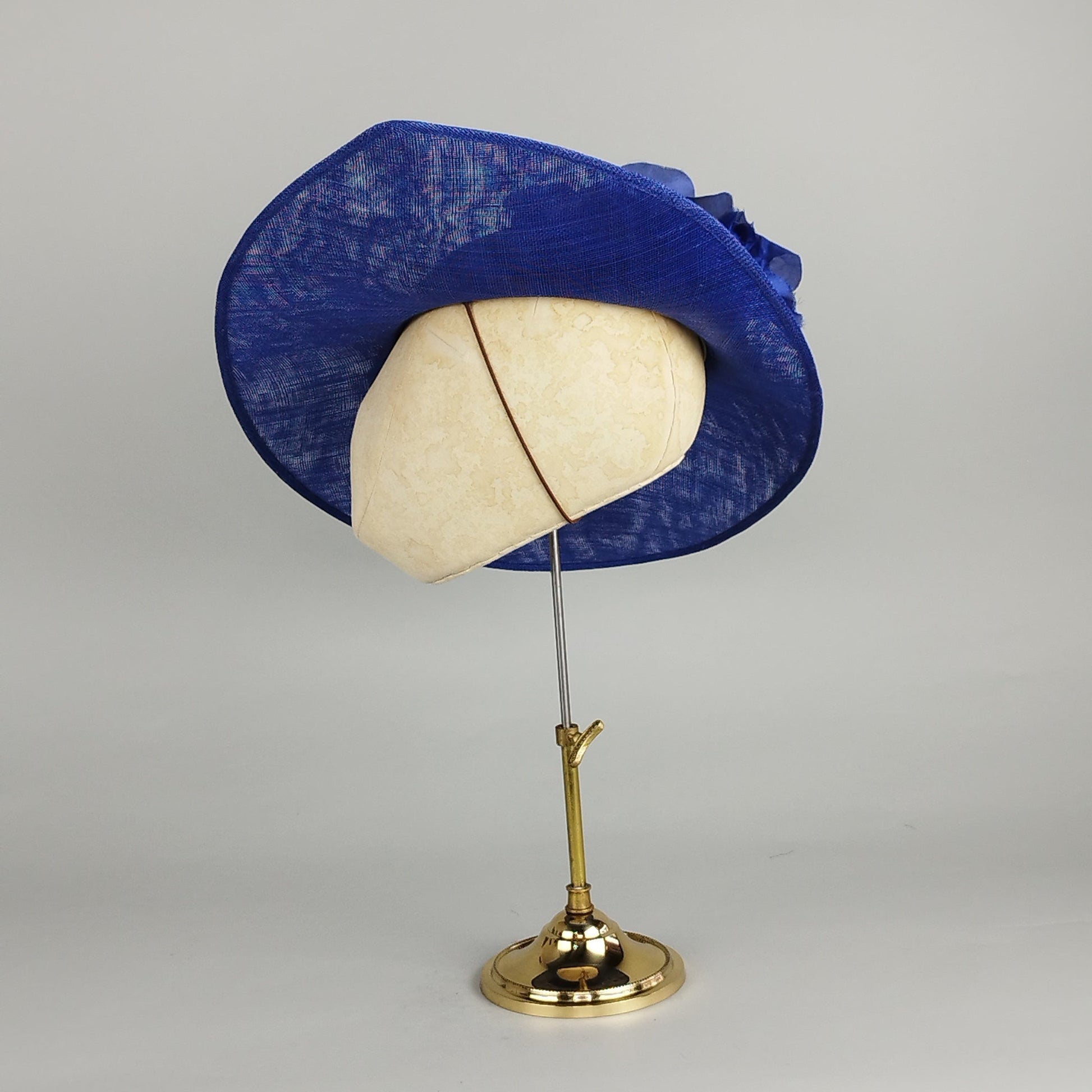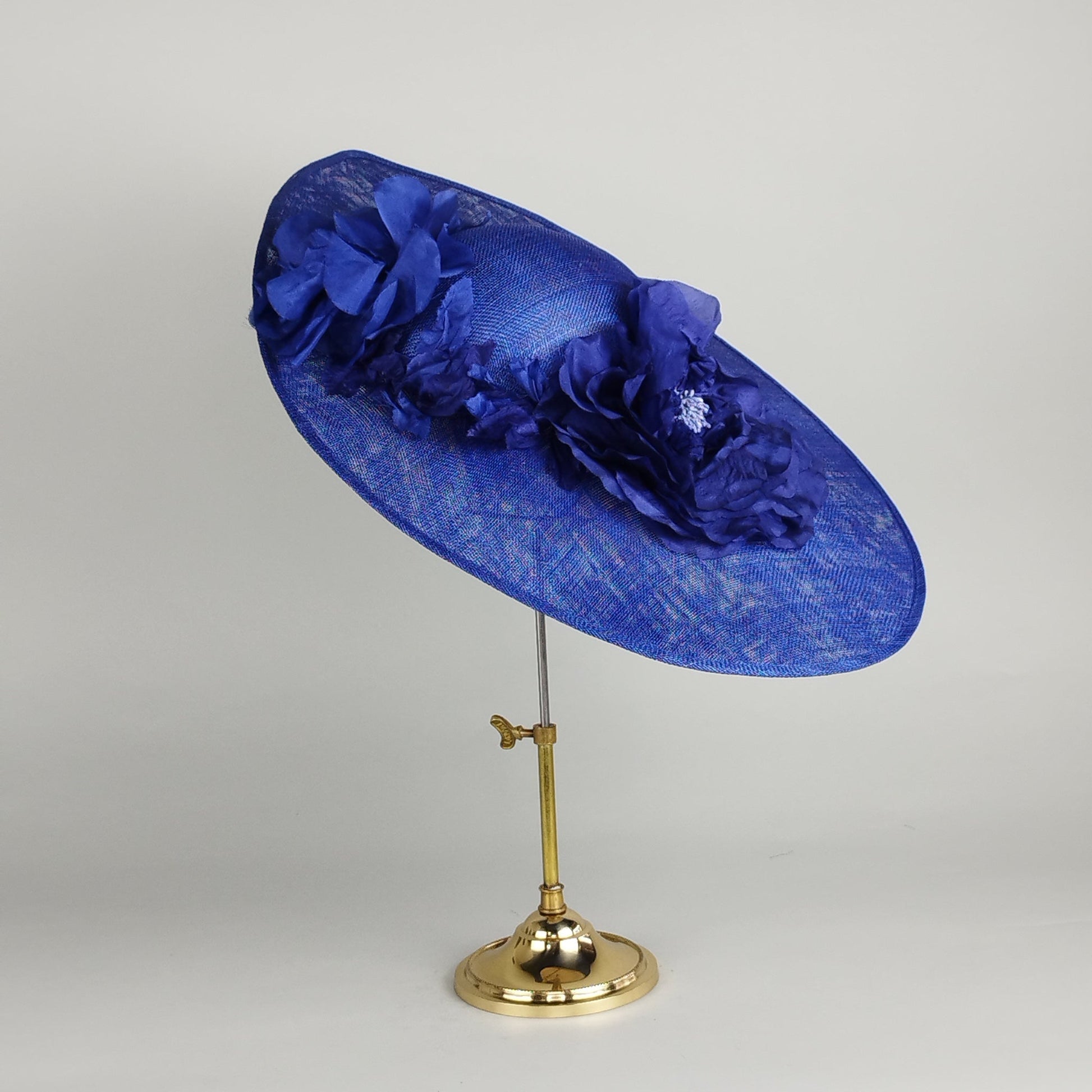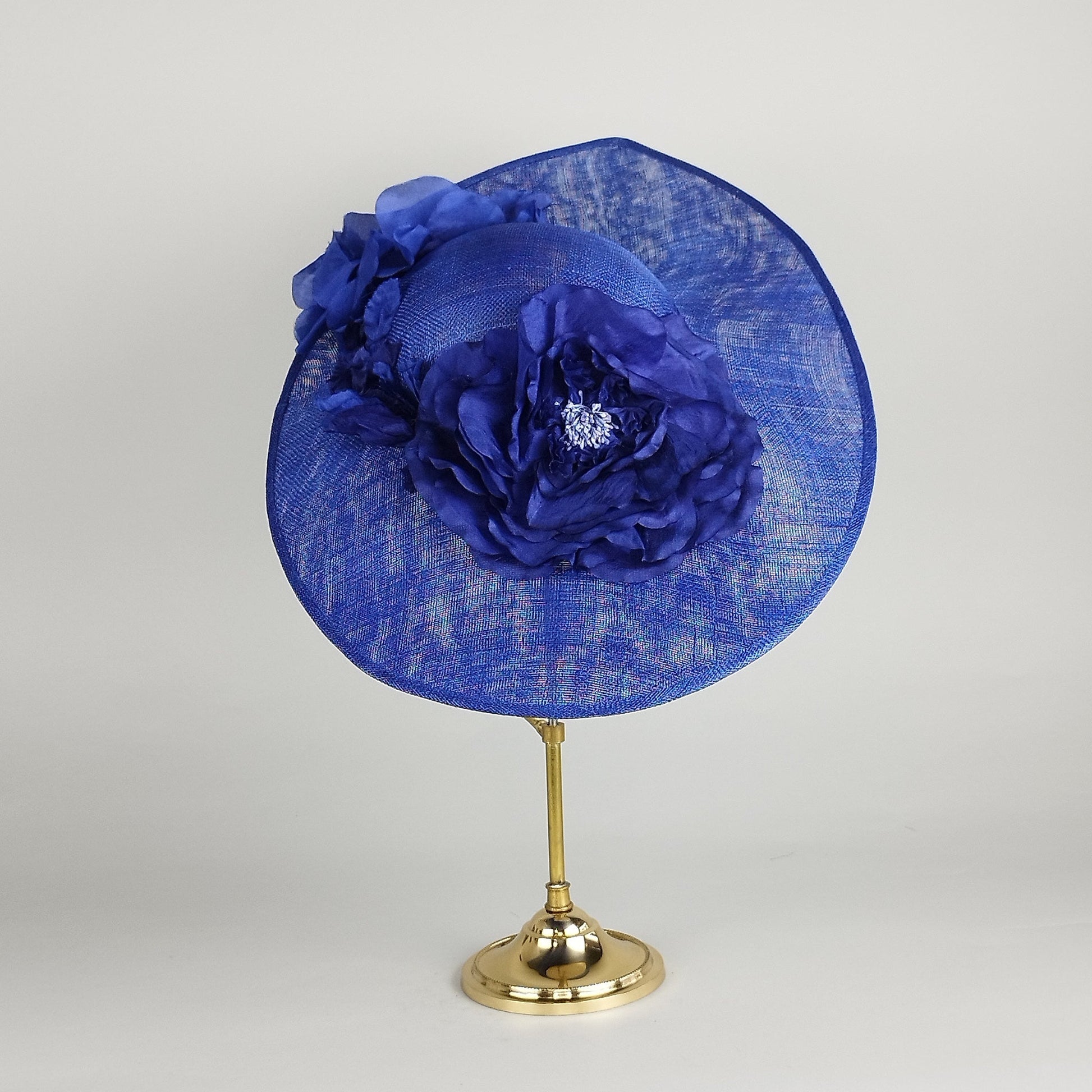 Introducing Blue Majesty, a royal blue wedding hat that embodies sophisticated charm with a contemporary twist. The royal blue base of this hat features large silk flowers in varying shades of royal, sapphire, and cobalt blue, wrapping around the back piece for a striking visual from every angle. With a sweeping brim and elegant structure, the subtle curvature of the design adds just the right amount of drama. The flowers, beautifully crafted in silk, provide a light and textured, luxurious finish, perfect for an event where you want to stand out with grace. This is a perfect royal blue hat for weddings, mother of the bride, Royal Ascot, or any occasion where you want to leave a lasting impression. Royal Blue is a difficult colour to match remotely so it's best to come to the studio if trying to match a royal blue outfit. If you can't make an appointment to view against your outfit in real life then look up hex codes #012b85 and #0b3073 for an idea
