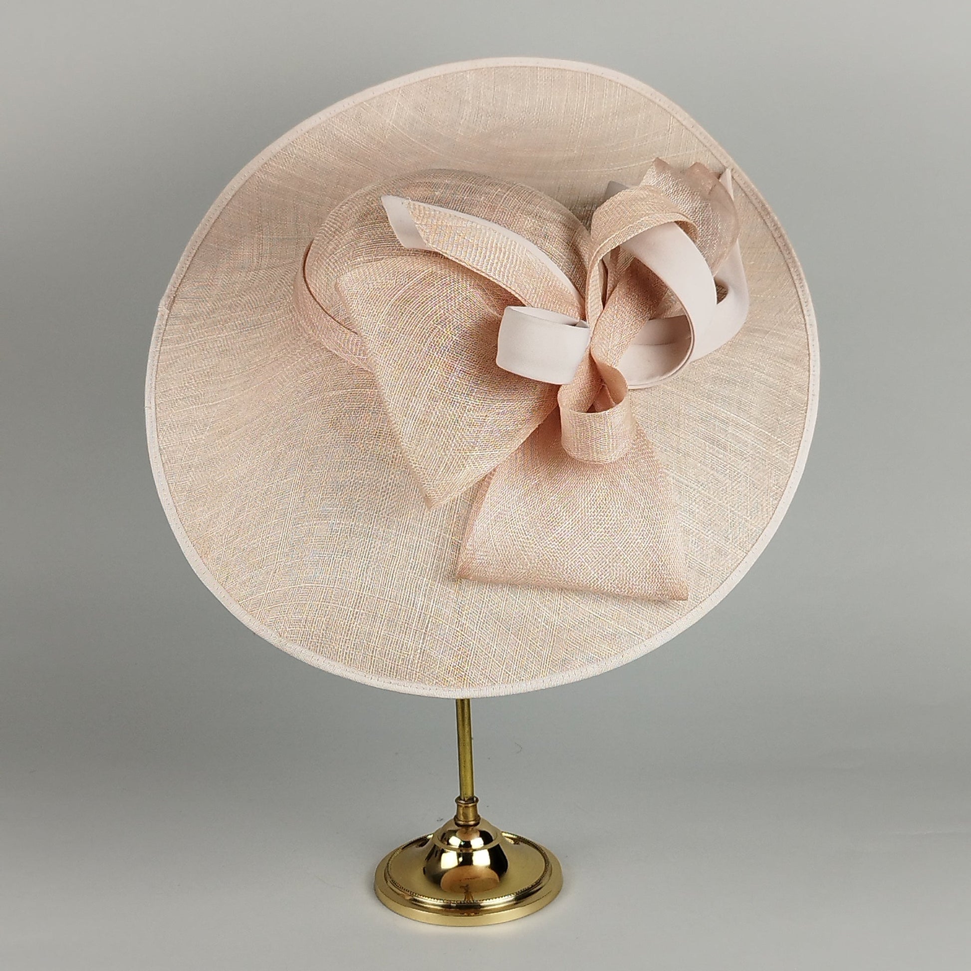 Introducing "Ethereal Loops" – a hat that perfectly blends sophistication with a modern edge. This nude pink wedding hat features stunning sinamay loops and swirls that create a delicate, yet strikingly structural design. This hat has a classic feel, without being traditional and with it's low crown we it would suit people looking for a blush pink fascinator as it sits almost like a hatinator. Whether you're attending a formal wedding or a Royal Ascot event, this hat provides the perfect balance of traditional millinery craftsmanship and modern elegance. Pairs equally with a tailored suit or more maxi, boho vibes. As well as the photos, see hex codes #fce5d7 and #fce5d7 for an idea of the colour.