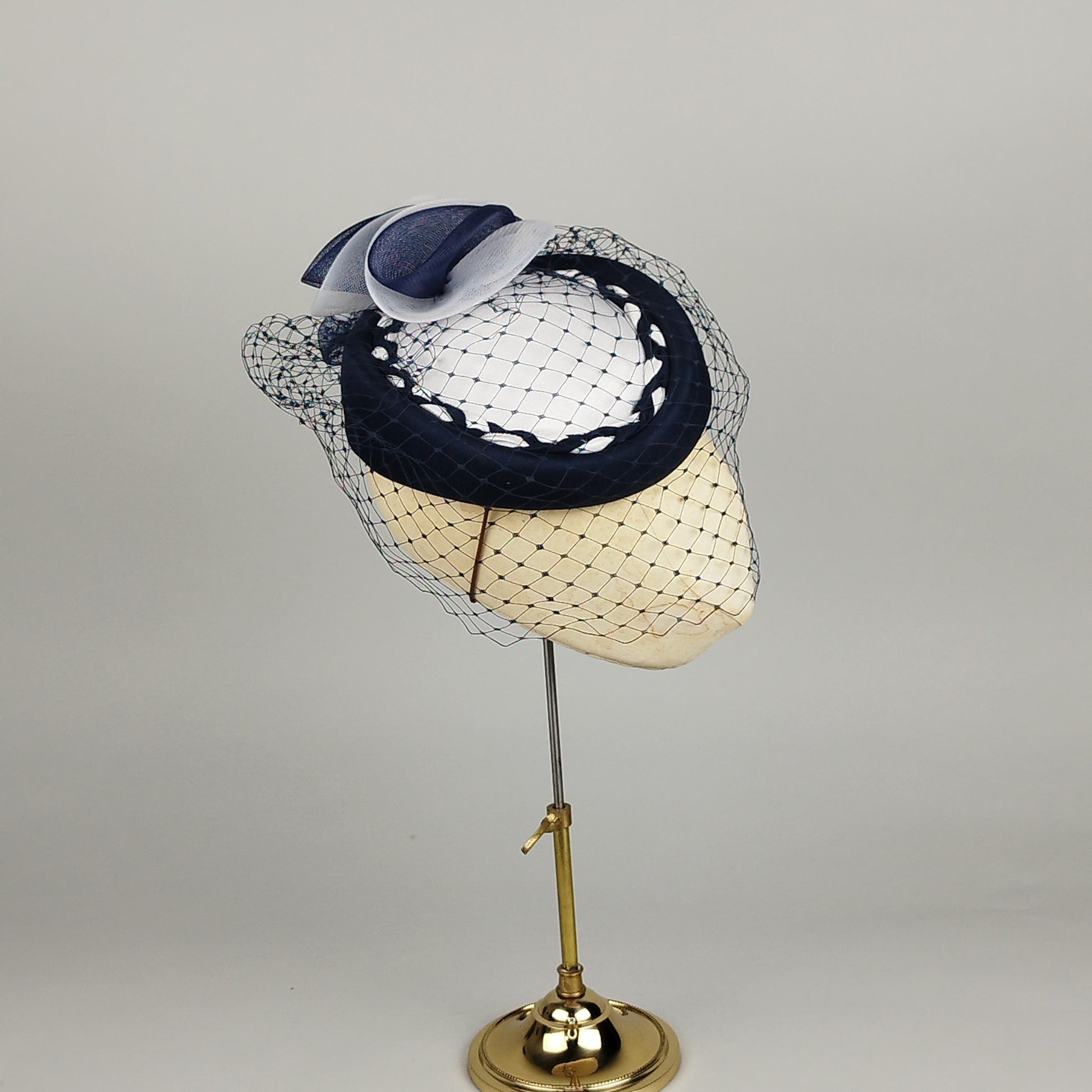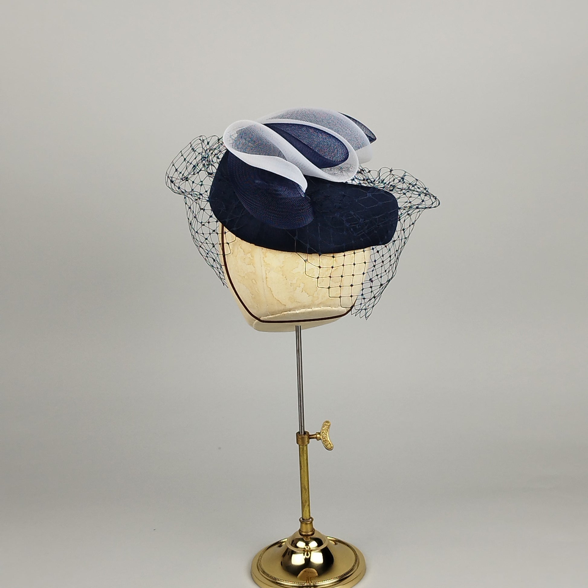 Introducing "Navy Allure" – a stunning vintage pillbox hat that blends elegance with modern charm. The Navy and White fascinator, framed by a delicate birdcage veil, is topped with a pair of soft crinoline loops in Navy and White, creating a striking contrast. This fascinator exudes sophistication, making it the perfect choice for weddings, garden parties, or any elegant occasion. The light, airy feel of the loops paired with the soft birdcage veil offers a sense of understated glamour, ensuring you shine without overwhelming your outfit